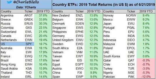 Jak widzimy na przedstawionym zestawieniu, najwięcej można było zyskać stawiając na ETF-y krajów, które kojarzą się z bardzo ryzykownymi kierunkami inwestycyjnymi. Od początku roku (do 21 czerwca) najwięcej zyskali inwestorzy posiadający ETF-y: Argentyny (37,6 proc.), Grecji (33,9 proc.), Rosji (33,3 proc.) oraz Kolumbii (22,5 proc.). Co ciekawe, z 48 porównywanych krajów, tylko 5 ETF-ów znajdowało się pod kreską. Największą stratę widzimy w przypadku Pakistanu (-12 proc.).