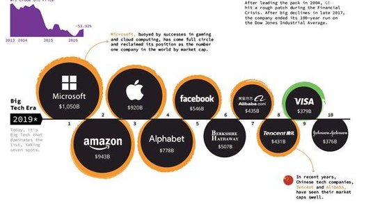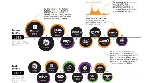 Na tej dość obszernej infografice porównanie zaczyna się od 1999 roku i kolejno – co 5 lat – przedstawiano aktualizację listy 10 największych przedsiębiorstw giełdowych. Co ciekawe, w 1999 r., tak jak obecnie, dominowały spółki technologiczne. Później – po pęknięciu bańki internetowej – nastąpiły spore przetasowania i w 2004 r. na liście były jedynie dwie firmy technologiczne.