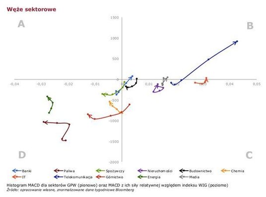 Jak interpretować „węże sektorowe"? Przedstawiona macierz pozwala na monitorowanie technicznej atrakcyjności poszczególnych branż na GPW. Na grafice „sektorowe węże" obrazują, jak zmieniała się atrakcyjność danego sektora w ciągu ostatnich pięciu tygodni. Jeśli wąż wyjdzie z pola D do pola A, to wtedy generowany jest techniczny sygnał kupna dla danego indeksu sektorowego. Z kolei przejście węża z pola A do B oznacza, że dany indeks sektorowy jest relatywnie silniejszy od indeksu WIG, co dodatkowo zwiększa atrakcyjność danego sektora. Przejście węża z pola B do C oznacza, że generowany jest sygnał sprzedaży (sektor ten jest już wykupiony i notowania zaczynają spadać). A przejście węża z pola z C do D oznacza, że spadający sektor jest dodatkowo słabszy niż indeks WIG.