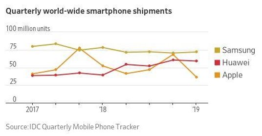 Przy okazji artykułu poświęconemu Huawei i powstrzymaniu planów tej firmy – m.in. poprzez wojnę handlową – dotyczących chęci dominacji w świecie smartfonów, „The Wall Street Journal" zaprezentował grafikę przedstawiającą liderów rynku. Jak widzimy, wspomniany Huawei, jest na drugim miejscu podium, pomiędzy liderującym Samsungiem a iPhone'ami z Apple'a.