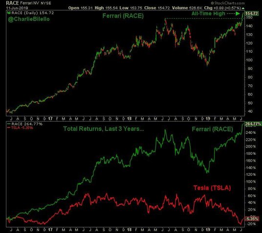 Mający ponad 110 tys. obserwujących na Twitterze Charlie Bilello porównał stopy zwrotu z ostatnich trzech lat dla akcji Ferrari z nowojorskiej giełdy z Teslą. Okazało się, że akcje koncernu produkującego luksusowe auta zdrożały w badanym okresie o blisko 265 proc. Z kolei przedsiębiorstwo, na czele którego stoi Elon Musk, w tym samym czasie straciło ponad 5 proc. Warto dodać, że tegoroczna stopa zwrotu z akcji Ferrari to ponad 56 proc., a Tesla straciła ok. 35 proc.
