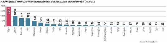 W zagraniczne papiery skarbowe najwięcej środków z końcem roku miały zainwestowane fundusze NN Investment Partners TFI (1,22 mld zł), TFI PZU (1,18 mld zł), PKO TFI (1,15 mld zł), Pekao TFI (1 mld zł), Santander TFI (0,61 mld zł). Licząc zaś jako udział w łącznych aktywach, zagraniczne obligacje skarbowe stanowiły blisko 11 proc. aktywów Millennium TFI, blisko 9 proc. kapitału zarządzanego przez NN IP TFI, a także 7,8 proc. w przypadku Rockbridge TFI oraz 7,3 proc. w aktywach Skarbca TFI.