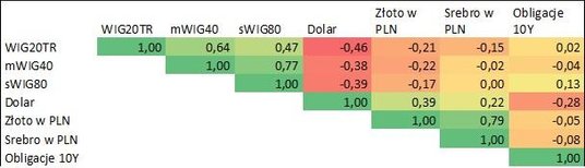 – Jak wynika z powyższej tabeli, najniższa korelacja w ostatnich latach występowała między indeksami rynku akcji (WIG20TR, mWIG40 i sWIG80) a dolarem. Z tego powodu, inwestor, który chce obniżyć ryzyko, powinien nabyć walutę USA. Dobrym pomysłem dla inwestora giełdowego może być także nabycie złota i srebra. Pewne efekty dywersyfikacji można uzyskać, inwestując w obligacje rządowe – dodaje.