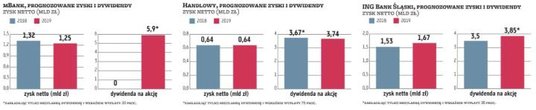 Stosunkowo klarowna sytuacja jest w ING Banku Śląskim, który nie ma hipotek walutowych i w tym roku wypłacił 30 proc. zysku z 2018 r. Dało to 455 mln zł, czyli 3,50 zł na akcję i skromną stopę dywidendy 1,7 proc. Tu sporo kapitału konsumuje szybki wzrost akcji kredytowej i zarząd mówi wprost, że priorytetem jest właśnie rozwój niż dążenie do wysokiego wskaźnika wypłaty. Dlatego ostrożnie można szacować, że w przyszłym roku do akcjonariuszy trafi również 30 proc. Prognozowany zysk netto ma wzrosnąć w tym roku o 9 proc., do 1,67 mld zł. W takim scenariuszu do inwestorów trafiłoby 500 mln zł, dałoby to 3,85 zł na akcję i 2 proc. stopy dywidendy (biorąc pod uwagę obecny kurs).