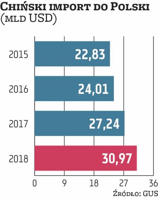 Państwo Środka było więc dla polskich eksporterów gorzej wykorzystywanym rynkiem niż np. Rumunia (5,37 mld USD polskiego eksportu w 2018 r.). Import z Chin do Polski sięgnął natomiast w zeszłym roku 30,97 mld USD. ChRL znalazła się na drugim miejsce w zestawieniu największych importerów do Polski w 2018 r. Więcej towarów sprowadziliśmy wówczas tylko z Niemiec (59,96 mld USD). Import z Chin do naszego kraju szybko się zwiększał w ostatnich latach. Jeszcze w 2010 r. wynosił 16,7 mld USD, a Chiny znajdowały się na trzeciej pozycji wśród największych importerów do Polski. W 2005 r. były pod tym względem na piątym miejscu i sprzedały nam towary za 5,5 mld USD.
