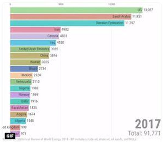 Zarówno w 1965 roku, jak i pod koniec trwania animacji w 2017 r., największym producentem ropy naftowej były Stany Zjednoczone. W połowie lat 60. XX wieku w USA było to 9 mln baryłek dziennie, a w 2017 r. ich produkcja była większa o ponad 4 mln baryłek dziennie.