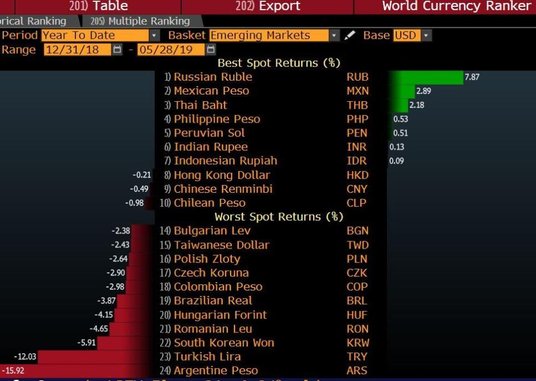 Przechodząc do tegorocznej kondycji poszczególnych krajów, zdecydowanym liderem umocnienia jest Rosja, której waluta w 2019 roku zyskała już blisko 8 proc. Na kolejnych miejscach – z dużo skromniejszymi wynikami – jest peso meksykańskie (2,89 proc.) oraz bat tajlandzki (2,18 proc.).
