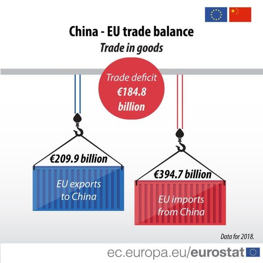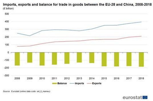 Deficyt handlowy UE z Państwem Środka wyniósł 184,8 mld euro w 2018 roku. Złożył się na niego: eksport w wysokości 209,9 mld euro i import z Chin o wartości 394,7 mld euro. To właśnie z Chin pochodzi najwięcej importowanych towarów do Wspólnoty. Na kolejnym miejscu są Stany Zjednoczone (267,3 mld euro), a na trzecim Rosja (168,3 mld euro). Z kolei Europejczycy najwięcej eksportują do USA (406,4 mld euro), a na drugiej pozycji są Chiny (209,9).