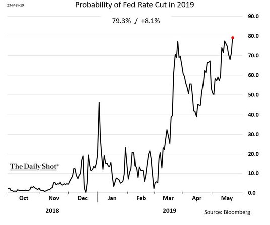 Na koncie „The Daily Shot" pojawił się kolejny wykres przedstawiający prawdopodobieństwo obniżki stóp procentowych przez Fed w 2019 r. Tym razem uczestnicy rynku szacują szansę, że bank centralny Stanów Zjednoczonych obniży stopy, na blisko 80 proc. (dokładnie 79,3 proc.). To największa wartość w tym roku.