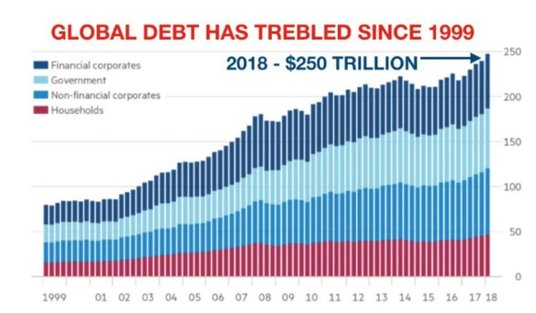 „Gold Telegraph" przedstawił wykres pokazujący strukturę (i jej zmiany na przestrzeni lat) globalnego zadłużenia. Dodatkowo w tytule wykresu podkreślono, że dług publiczny na świecie potroił się od 1999 roku.