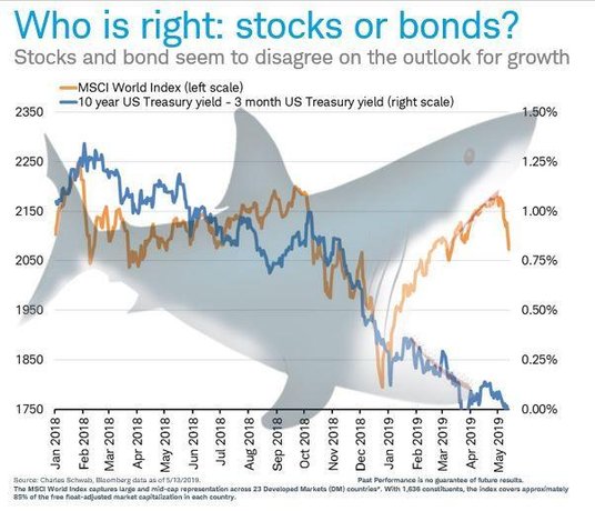 Stopa zwrotu z akcji rosła w 2019 r., a w tym samym czasie krzywa rentowności obligacji malała. Stąd pojawiła się na wykresie nienaturalna „paszcza", w którą Jeffrey Kleintop dopasował rekina.