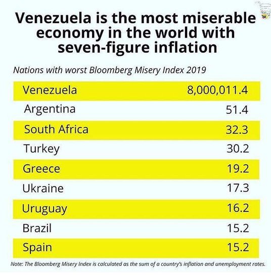 Od kilku lat niewiele zmienia się w kwestii najbardziej „nieszczęśliwych" gospodarek. Nadal najgorszą z nich ma Wenezuela. Z tą różnicą, że sytuacja w tym południowoamerykańskim kraju stale się pogarsza. Beznadziejną sytuację Wenezuelczyków obrazuje także omawiany wskaźnik i wynik kraju w Bloomberg Misery Index na poziomie 8 000 011,4 pkt. Kolejne w „rankingu nieszczęścia" państwa mają dużo mniejsze wartości punktowe: Argentyna (51,4), RPA (32,3), Turcja (30,2) oraz Grecja (19,2).