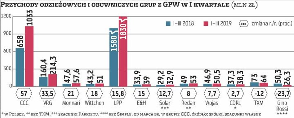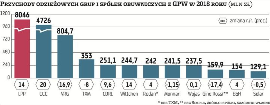 Jeśli wziąć pod lupę giełdowych gigantów, to okaże się, że zarówno przychody odzieżowego LPP, właściciela m.in. Reserved, jak i obuwniczego CCC w Polsce w ubiegłym roku powiększyły się o ponad 9 proc. Wiadomo jednak, że obie firmy, podobnie jak część mniejszych już wymienionych, inwestowała w rozwój sieci sklepów i rozwijała sprzedaż w internecie.