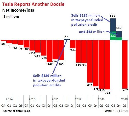 Wolf Richter skoncentrował się na fatalnych wynikach spółki z ostatnich lat (i braku perspektyw na poprawę). Zaznaczył on także, pokazując to na wykresie, że wcześniejsze pozytywne wyniki Tesli (za III i IV kwartał ub.r.) w dużej mierze zależały od ujawnień sprzedaży uprawnień do emisji CO2. W swoich rozważaniach komentator zwrócił uwagę także na cenę akcji Tesli, która według niego jest drastycznie zawyżona.