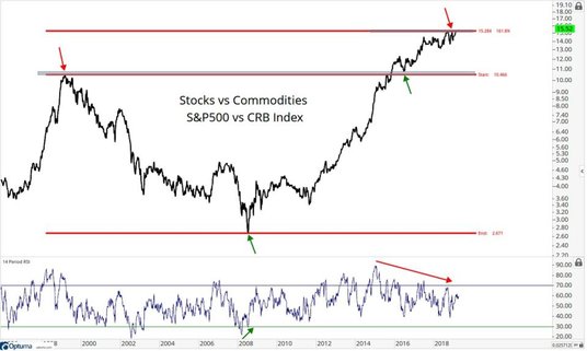 Popularny w mediach społecznościowych J.C. Parets zaprezentował wykres pokazujący siłę amerykańskich akcji (jako S&P 500) względem surowców (jako CRB Index, czyli indeksu opisującego koniunkturę surowców). Im wyższa wartość na wykresie, tym większa dominacja akcji z USA.