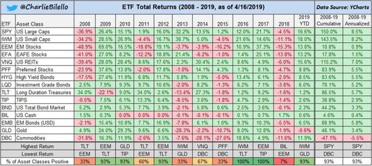 Pokazuje to także zestawienie przygotowane przez Charlie'ego Bilello, szefa działu analiz w Pension Partners, które przedstawia roczne stopy zwrotu dla poszczególnych klas aktywów (poprzez zachowanie ETF-ów).