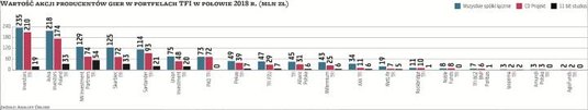 Oczywiście wśród funduszy inwestycyjnych najbardziej popularną spółką jest lider branży, czyli CD Projekt. Z końcem czerwca ubiegłego roku – jak wynika z danych zgromadzonych przez serwis Analizy Online – akcje producenta „Wiedźmina" miało w portfelach aż 26 towarzystw funduszy inwestycyjnych. Łączna wartość akcji CD Projektu należących do TFI wynosiła wówczas 920 mln zł, co przy ówczesnej kapitalizacji firmy oznaczało około 6 proc. łącznego kapitału. Dziś wartość giełdowa CD Projektu to nieco ponad 20 mld zł.