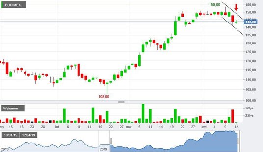 „Budimex jest w długoterminowym trendzie spadkowym, trwającym od połowy 2017 r., gdy kurs wynosił 288 zł. Przecena przyspieszyła w połowie 2018 r., w wyniku czego kurs osiągnął lokalne minimum na poziomie 96,40 we wrześniu 2018 r. i przeszedł w średnioterminową konsolidację, którą z góry ogranicza pułap 23,6-proc. zniesienia spadków od 2017 r. Ostatnie dynamiczne zwyżki z technicznego punktu widzenia są efektem wybicia się z konsolidacji i zniesienia 38,2 proc. przeceny trwającej od połowy 2017 r. Mocne wykupienie i brak sforsowania rejonu 150 zł (zniesienie 38,2 proc.) zachęca podaż do ataku, więc inicjatywę zdaje się przejmować strona podażowa, której celem byłoby sprowadzenie kursu poniżej 127,6 zł (zniesienie 23,6 proc.). Silne wykupienie wskaźnika STS (Stochastic) i sygnał sprzedaży na RSI (indeks siły relatywnej) sygnalizuje przejęcie inicjatywy przez stronę podażową.