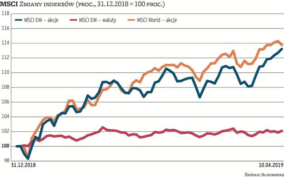 O skali rozbieżności między zachowaniem rynków akcji a rynkami walut najlepiej świadczy zachowanie indeksów MSCI. Wskaźnik odzwierciedlający zachowanie akcji z rynków rozwijających się zyskał w I kwartale prawie 10 proc. Obecnie jest już ponad 13 proc. na plusie (podobne wyniki notuje globalny indeks akcji MSCI World Index). Analogiczny indeks dla walut z rynków rozwijających się w I kwartale zyskał niecałe 2 proc., natomiast aktualnie jest 2,1 proc. na plusie.