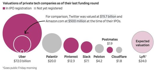Wizualizacja przedstawia wyceny spółek technologicznych szykujących się do IPO. Wyraźnie na niej widać, jak Uber deklasuje pod względem szacowanej wartości pozostałe przedsiębiorstwa zbliżające się do giełdowego debiutu. Przykładowo, Palantir Technologies szacowane było na 20 mld dolarów amerykańskich, Pinterest na 12,3 mld USD, a Slack 7,1 mld USD. Z kolei Uber był wyceniany na 72 mld USD. Obecnie podaje się wyższą wycenę – w okolicy 100 mld USD.