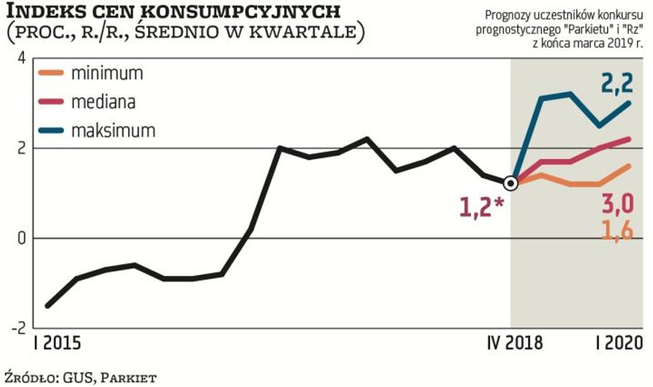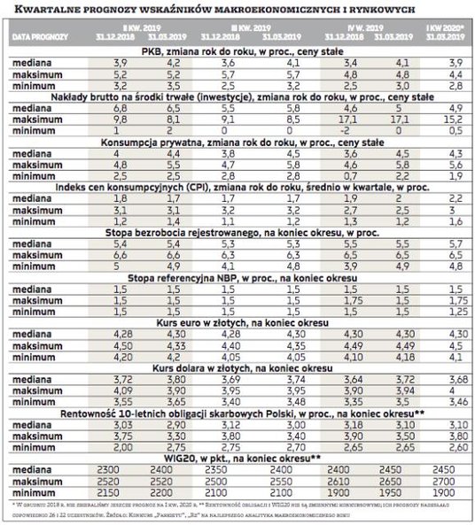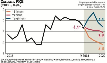 Zakładając, że w I kwartale br. PKB Polski powiększył się o 4,4 proc., jak przeciętnie szacują ekonomiści, średnie tempo wzrostu tego wskaźnika w 2019 r. wyniesie 4,2 proc. W porównaniu z ub.r., gdy Polska gospodarka powiększyła się o 5,1 proc., będzie to oznaczało spowolnienie wzrostu, ale wyraźnie łagodniejsze, niż można się było obawiać jeszcze kilka miesięcy temu. Na przełomie grudnia i stycznia, gdy poprzednio zbieraliśmy prognozy od uczestników konkursu, przeciętnie oczekiwali oni, że średnie tempo wzrostu PKB w 2019 r. będzie wynosiło 3,8 proc.