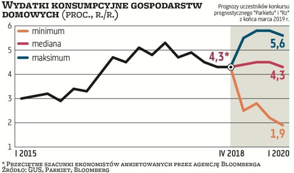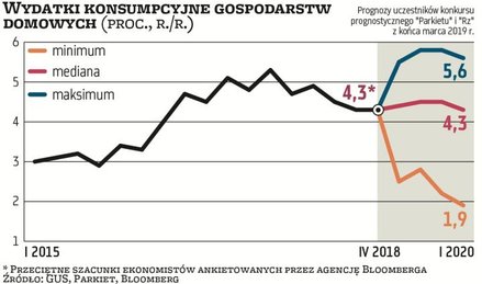 Z tym że tzw. piątka PiS, czyli pakiet przedwyborczych obietnic rządu, obejmujący m.in. rozszerzenie programu 500+ na każde dziecko oraz wypłatę emerytom trzynastek, pobudzi gospodarkę, nawet jeśli ten efekt zostanie osłabiony przez podwyżkę podatków lub redukcję innych wydatków publicznych, zgadza się zdecydowana większość ekonomistów. Tak można interpretować zmiany prognozowanego tempa wzrostu wydatków konsumpcyjnych.