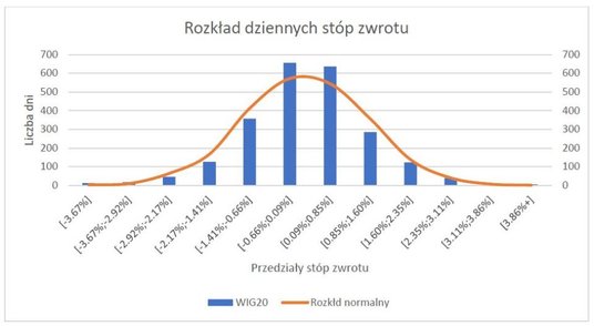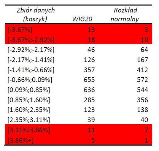 – Wykres przedstawia rozkład dziennych stóp zwrotu z WIG20TR w porównaniu z rozkładem normalnym od początku 2010 r. Rozkład normalny (losowy) jest często stosowany w finansach, zarówno przy wycenie akcji jak i opcji. Powyższe dane sugerują, że stopy zwrotu z WIG20TR są zbliżone do rozkładu normalnego. Występują jednak pewne różnice. Przede wszystkim ogony osiągniętych stóp zwrotu są grubsze – mówi Tomasz Wyłuda, dyrektor biura doradztwa inwestycyjnego Credit Agricole.