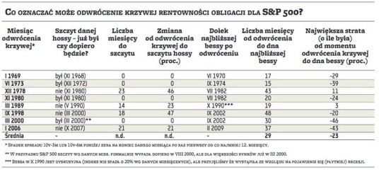 Prześledzenie rozwoju wydarzeń na Wall Street po odwróceniu krzywej pozwala odpowiedzieć na pytanie, dlaczego cała sprawa wywołuje spore emocje, dyskusje i często sprzeczne argumenty. W całym tym zasobie historycznych scenariuszy znajdziemy, szczególnie na krótką metę, „dla każdego coś dobrego". Jest tu spora porcja dla niedźwiedzi. Przypadki z lat 1969, 1973, 1980 i 2000 są jednoznacznie pesymistyczne – odwrócenie krzywej miało miejsce w okolicach szczytu hossy lub już nawet po rozpoczęciu bessy. Ale i byczo nastawieni komentatorzy też znajdą coś dla siebie – przypadki z lat 1978, 1989, 1998 i 2006 nie wiązały się z natychmiastowym rozwojem bessy. Wręcz przeciwnie, przez pewien czas – nawet wiele miesięcy – kontynuowana była wspinaczka S&P 500 na nowe szczyty. Co więcej, błędne byłoby przypuszczenie, że ta kontynuacja hossy oznaczała niewielką zwyżkę. W niektórych przypadkach (patrz – tabela) S&P 500 w samej końcówce cyklu koniunkturalnego zdołał wypracować wręcz imponujące stopy zwrotu (1978–1980, 1998–2000).