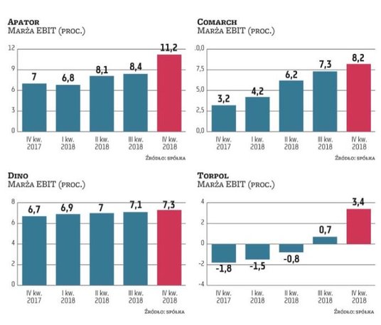 Korzystne warunki do poprawy marż to zwykle efekt otoczenia, w jakim dana firma działa. Takie warunki mają m.in. spółki z sektora handlu detalicznego. Korzysta z nich Dino Polska. Właściciel sieci supermarketów w imponującym tempie poprawia wyniki, co jest efektem rozwoju organicznego i wzrostu tzw. sprzedaży porównywalnej w sklepach. – Poprawa marży brutto pozwoliła Dino z nawiązką pokryć wzrost kosztów wynagrodzeń oraz usług obcych. Wraz ze wzrostem sieci, Dino zatrudnia coraz więcej pracowników, jednak ze względu na lokalizację sklepów w małych i średnich miastach presja płac jest tam mniejsza. Mimo podwyżek płacy minimalnej firma ma koszty wynagrodzeń pod kontrolą. Choć negatywny wpływ na marże operacyjne miał wzrost kosztów usług obcych, w tym głównie koszt usług transportowych – zauważa Krzysztof Kawa, analityk Ipopemy. – Jeśli chodzi o kolejne kwartały, to oczekuję po Dino kontynuacji trendów z 2018 r. Zakładam, że Dino wciąż będzie w stanie poprawiać warunki zakupów od dostawców, co powinno z nawiązką rekompensować wzrost wynagrodzeń – ocenia ekspert.