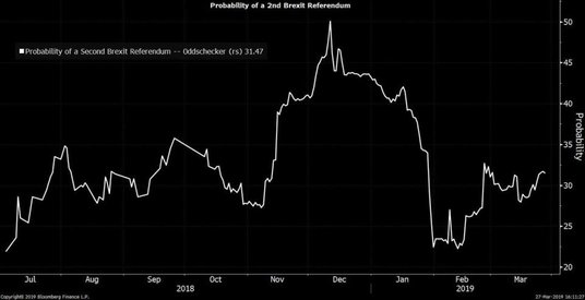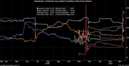 Michael McDonough z Bloomberga zaprezentował wczoraj wykresy, które powstały na podstawie danych z Oddschecker, czyli serwisu porównującego oferty bukmacherów. Na przedstawionych grafikach zamieścił m.in. prawdopodobieństwo drugiego referendum w sprawie brexitu, a także szanse brytyjskich polityków na zostanie kolejnym premierem Wielkiej Brytanii.