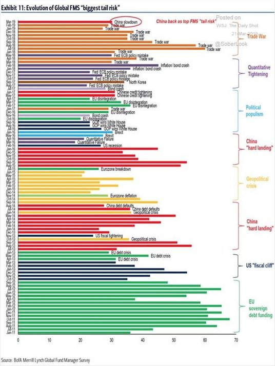 Ronnie Stoeferle, austriacki inwestor i zarządzający, przedstawił w mediach społecznościowych wykres, na którym zostały uwzględnione comiesięczne największe obawy zarządzających globalnymi funduszami. Po okresie dziewięciu miesięcy, gdy głównym ryzykiem (czyli mającym największy udział w ankietach) uznawana była „wojna handlowa" między USA i Chinami, teraz przyszedł czas na zmianę i skupienie się na niepokojących danych z gospodarki Państwa Środka.