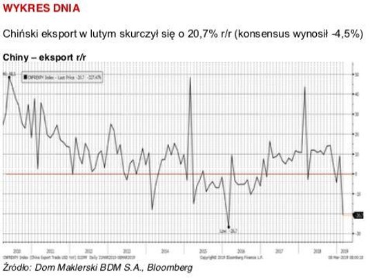 Jak wskazują eksperci, obecne zniżki indeksów giełdowych na świecie są przede wszystkim wynikiem rosnących obaw o globalny wzrost gospodarczy. Wczorajsze obniżenie prognoz wzrostu dla PKB na 2019 r. przez EBC (do 1,1 proc. z 1,7 proc. poprzednio) – jak i niepokojące informacje z chińskiej gospodarki, co m.in. pokazuje wykres DM BDM, tylko zwiększa niepokój inwestorów co do przyszłego wzrostu.