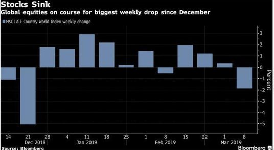 Bloomberg przygotował wykres, na którym przedstawił, że szykuje się najgorszy tydzień na globalnych rynkach akcji od grudnia ub.r.