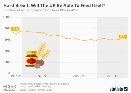 Jak widzimy na grafice, od wielu lat spada samowystarczalność Wielkiej Brytanii w kwestii wyżywienia swoich mieszkańców. Taka sytuacja, połączona z brexitem bez porozumienia, może spowodować, że Brytyjczycy szybko zatęsknią za Unią Europejską.