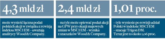 Przedstawiciele Wood & Company mówią z kolei o potencjalnych odpływach przekraczających nawet 4 mld zł. – Kwestia zwyżek WIG20 w kontekście zmian w indeksie MSCI EM w najbliższych miesiącach będzie uzależniona również od tego, czy obecnie widoczny napływ kapitałów do ETF-ów inwestujących w emerging markets będzie kontynuowany. Niemniej widzimy duże ryzyko słabości polskiego rynku akcji w okresie przed rewizjami MSCI EM – mówi Paweł Wieprzowski, analityk Wood & Company.