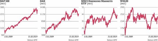 Mimo wszystko indeks giełdy we Frankfurcie w trakcie pierwszych czterech sesji minionego tygodnia szedł w górę o ponad 1 proc., starając się zbliżyć do 11 500 punktów. Nikkei drugi tydzień z rządu zalicza zwyżkę sięgającą 2,7 proc., docierając do poziomu najwyższego od połowy grudnia ubiegłego roku. Dobre humory nie opuszczają inwestorów w Londynie, gdzie indeks zwyżkował do czwartku o ponad 1 proc. Nie najgorsze nastroje panowały także na rynkach wschodzących. MSCI Emerging Markets rósł o prawie 1 proc., oznaki lekkiej słabości wykazując dopiero w czwartek. O 2,6 proc. w górę szedł Shanghai Composite, który w czwartek momentami zbliżał się do 2800 punktów, czyli do poziomu najwyższego od września ubiegłego roku, jednak pod koniec dnia zaliczył wyraźne cofnięcie.