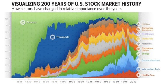Aktywny użytkownik Twittera @WinfieldSmart przypomniał w weekend ciekawy wykres opublikowany w styczniu przez visualcapitalist.com. Widzimy na nim, jak przez ponad 200 lat zmieniał się – w ujęciu sektorowym – amerykański rynek kapitałowy.
