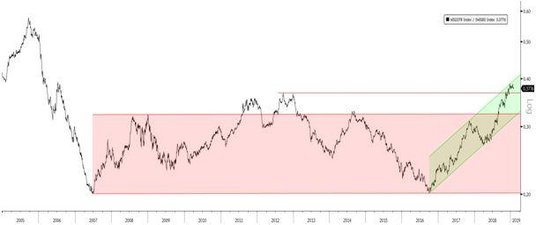 I kontynuuje: – W powyższej konwencji interesująco wypada zestawienie indeksu krajowych blue chips, czyli WIG20, wobec sWIG80. Taki wykres siły relatywnej znajduje się na najwyższym poziomie od 2006 r. i to zazwyczaj na tym poziomie następowała zmiana warty i małe spółki zaczynały się zachowywać relatywnie lepiej. „Relatywnie lepiej" w tej analizie oznacza, że albo mniej spadały, albo silniej rosły. Gwoli ścisłości – wyjątkiem w relacji WIG20 vs. sWIG80 jest rok 2005, gdy blue chis zostawiły maluch daleko w tyle.
