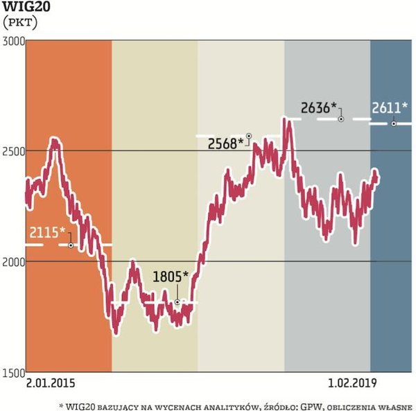 Wyceny spółek, w porównaniu z historycznymi wskaźnikami, są atrakcyjne – w szczególności dotyczy to przedsiębiorstw małych i średnich, które w ostatnich latach fala wzrostowa ominęła. Potencjał do zwyżek mają też jednak blue chips – a przynajmniej takie wnioski płyną z analizy rekomendacji. Przejrzeliśmy te, które trafiły na rynek w grudniu i styczniu. Na ich bazie obliczyliśmy średnią cenę docelową dla każdej spółki i na ich podstawie policzyliśmy „WIG20-teoretyczny", uwzględniając aktualną wagę każdej spółki w indeksie. Otrzymaliśmy wartość 2611 pkt, a więc o niemal 10 proc. wyższą od obecnego poziomu indeksu. W piątek notował on nikłe zmiany i oscylował w okolicach 2379 pkt. Od tygodnia utrzymuje się poniżej poziomu 2400 pkt.