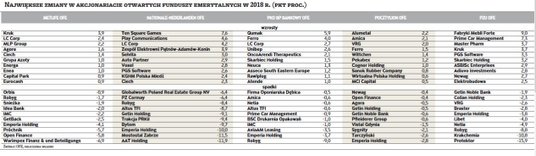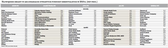 W tabelach prezentujemy największe zmiany w akcjonariatach spółek dokonane w poprzednim roku przez otwarte fundusze emerytalne. Pod uwagę wzięliśmy również udziały w tych firmach, które w 2018 r. opuściły giełdę, jak np. Emperię Holidng czy Robyg. Warto też pamiętać, że aktywa należące do Pekao OFE zostały przeniesione do OFE PZU Złota Jesień.