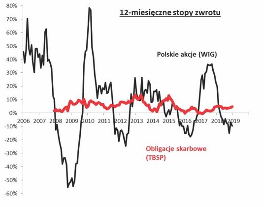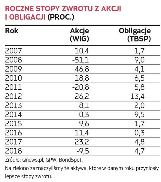 Z kolei równie tendencyjne przyjęcie rekordu wszech czasów WIG-u (rok 2007) jako punktu startowego dałoby zgoła odmienne rezultaty – od tego czasu obligacje dały zarobić ponad 80 proc., podczas gdy WIG jest ciągle na minusie (o wspomniany rekord przez chwilę otarł się przed rokiem).