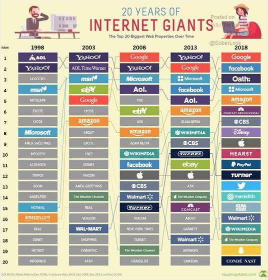 Jedne przedsiębiorstwa bardzo dobrze wykorzystały ostatnie dwie dekady – niezwykle sprzyjające biznesom internetowym – a inne zaprzepaściły tę szansę. To m.in. podsumowała Liz Ann Sonders z grupy Charles Schwab, która przedstawiła na grafice, jak w ciągu ostatnich 20 lat zmieniał się układ sił wśród internetowych hegemonów.