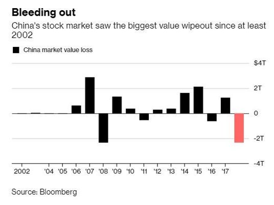 Aby przekonać się jak fatalny był to rok dla chińskiego rynku akcji, wystarczy spojrzeć na Shanghai Composite Index, który przez ostatnie 12 miesięcy stracił blisko 25 proc. swojej wartości. Chcąc jeszcze bardziej pokazać słabość rynku kapitałowego Państwa Środka, Tracy Alloway z Bloomberg Markets podaje, że aktywa na chińskim rynku kapitałowym straciły w 2018 roku na wartości ok. 2,4 biliona dolarów. Jest to najwięcej od 2002 r., kiedy to Bloomberg zaczął gromadzić szczegółowe dane o chińskich giełdach (Shanghai i Shenzhen).