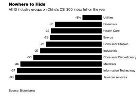 Oczywiście na fatalne giełdowe miesiące w Chinach duży wpływ miała wojna handlowa między Stanami Zjednoczonymi a Państwem Środka. Jednak, jak zaznacza Tracy Alloway, na chińskim rynku kapitałowym od dłuższego czasu nie dzieje się najlepiej, m.in. stale spadają obroty. Kumulacja zewnętrznych i wewnętrznych negatywnych czynników spowodowała, że wszystkie wskaźniki sektorowe z indeksu CSI 300 są obecnie na minusie. Szczególnie ucierpiały chińskie spółki telekomunikacyjne (-38 proc.) oraz firmy technologiczne (-37 proc.). Najmniej straciły – co jest zgodne z teorią inwestowania – spółki defensywne, czyli te z sektora użyteczności publicznej (tzw. utilities), które potaniały ok. 8 proc.
