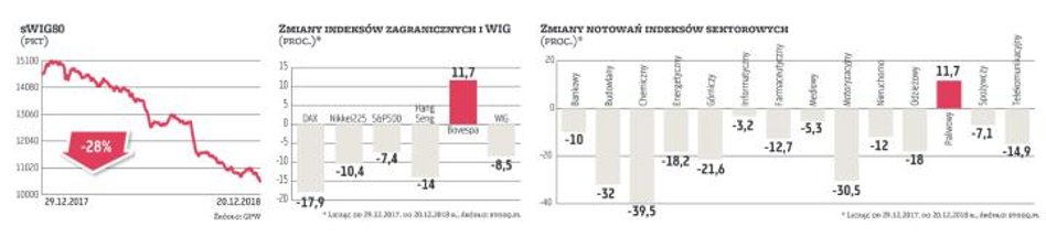 Mijający rok na warszawskim parkiecie należał do giełdowych niedźwiedzi. Wszystkie główne indeksy (licząc od 29.12.2017 r. do 20.12.2018 r.) kończyły go pod kreską. Zdecydowanie najsłabszy był segment małych spółek, bowiem sWIG80 spadł o 28 proc. i wyraźnie przekroczył umowną granicę bessy. Słabość maluchów to w dużej mierze pokłosie afery wokół spółki GetBack, która niewątpliwie zostanie zapamiętana, jako tegoroczny antybohater. Relatywnie lepiej radziły sobie w tym roku duże spółki, choć ostatecznie WIG20 też kończyły „sezon" 6,3 proc. na minusie.