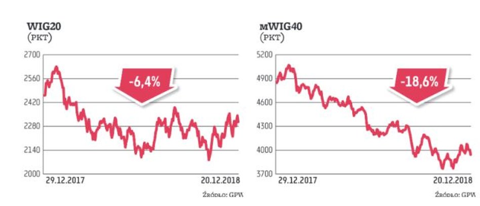 Liczby potwierdzają, że rynek w 2018 r. był rynkiem niedźwiedzia. A jaki będzie 2019 r.? Posiłkując się analizą techniczną, widać na GPW kilka pozytywów. Indeks WIG20 porusza się ostatnio w kanale wzrostowym, którego zasięg można szacować przynajmniej na 2400 pkt. Z kolei mWIG40 zbudował formację podwójnego dna z zasięgiem 4160 pkt. Szkopuł w tym, że są to układy krótkoterminowe, a do tego dochodzi pogrążony w bessie sWIG80. Niepokojąco wygląda też sytuacja czołowych graczy globalnych. Parkiet we Frankfurcie pozostaje pod kontrolą podaży, a ten na Wall Street coraz bardziej jej ulega. Analitycy zwracają uwagę, że przełamanie przez S&P 500 wsparcia na 2600 pkt to zaproszenie do zejścia o kolejnych 300 pkt. Przy takim zachowaniu amerykańskiego rynku akcji trudno oczekiwać, by Warszawa konsekwentnie szła pod prąd światowych trendów.