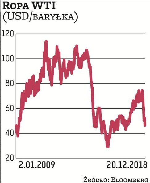 Wygląda na to, że wszystko sprzysięgło się przeciw ropie naftowej. Niedawne obawy związane z sankcjami nałożonymi przez USA na Iran okazały się jedynie chwilowym, choć bardzo silnym impulsem do wzrostu notowań. Nie ma już po nim śladu. Nie pomogła też decyzja OPEC i Rosji o ograniczeniu wydobycia. Ceny surowca idą w dół bez najmniejszego oporu. Wydobycie w Stanach Zjednoczonych rośnie, zapasy są coraz większe, koniunktura w światowej gospodarce pogarsza się, powodując spadek popytu, cięcia produkcji przez OPEC na razie nie działają. Tak pesymistycznych nastrojów nie było już dawno. Nic więc dziwnego, że rynek wygląda fatalnie. W miniony czwartek cena WTI spadła o ponad 4 proc., zbliżając się do 45 dolarów za baryłkę, czyli do poziomu najniższego od sierpnia ubiegłego roku. W trakcie pierwszych czterech dni minionego tygodnia notowania zniżkowały o niemal 10 proc. Czarna seria czarnego złota trwa już 11 tygodni, z jednym niewielkim przystankiem. W tym czasie WTI potaniała z 76,4 do 46 dolarów za baryłkę, a więc o 40 proc. Większe spadki notowano ostatnio jedynie w czasie globalnego kryzysu finansowego w latach 2008–2009 oraz 2014–2016 po decyzji Arabii Saudyjskiej o zalaniu świata tanią ropą. Być może obecna przecena przyczyni się do łagodniejszego przebiegu spodziewanej dekoniunktury w światowej gospodarce. Gorsze perspektywy zaczynają być widoczne na rynku miedzi. Kontrakty terminowe na ten metal traciły w minionym tygodniu ponad 2 proc., schodząc poniżej 270 centów za funt.