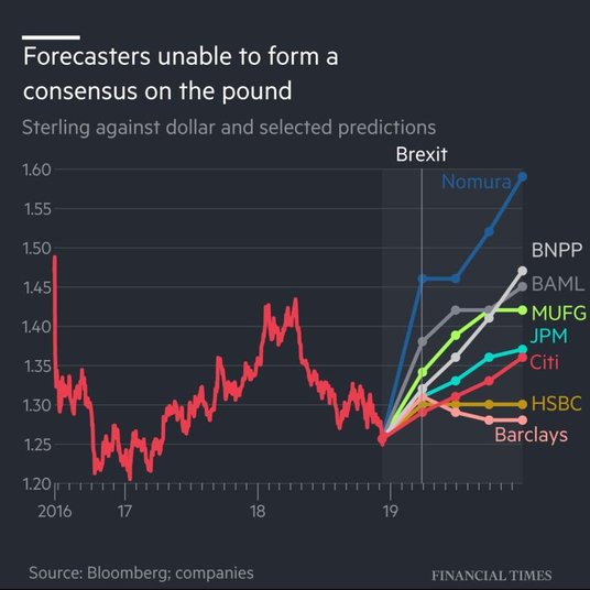 Daniel Winter, dziennikarz zajmujący się rynkiem finansowym w „Financial Times", pokusił się o zebranie prognoz instytucji finansowych dotyczących funta brytyjskiego (konkretnie dla pary GBP/USD). Główną konkluzją z przewidywań ekspertów dotyczących brytyjskiej waluty jest fakt, że... może być różnie. Od prognoz japońskiej instytucji Nomura zakładających dojście aż do poziomu bliskiego 1,6 na koniec 2019 r., do scenariuszy przyjmujących pozostanie kursu GBP/USD na obecnych poziomach.
