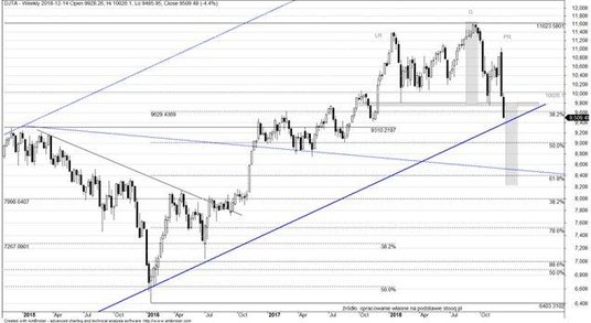 – DJTA aktywował formację G&R (głowy z ramionami – red.), której zasięg wskazuje na ruch w kierunku średnioterminowej strefy wsparcia zlokalizowanej przy 8500 pkt. Zasięg spadków liczony według tej formacji wskazuje na zejście w kierunku fibozniesienia 61,8 proc., jednakże taki ruch miałby długoterminowe konsekwencje ze względu na naruszenie kilkuletniej linii trendu wzrostowego. Należy zauważyć, że struktura trwającej od września przeceny odbiega od poprzednich korekt (2011 r., 2015 r.), co także oznaczałoby, że niedźwiedzie nie powiedziały ostatniego słowa i mają zielone światło do kontynuacji deprecjacji. To co mogłoby poprawić obecne, negatywne perspektywy dla DJTA, to zamknięcie się bieżącego tygodnia powyżej poziomu 10026,1 pkt, a do tej wysokości kreski są na korzyść spadków – ocenia Piotr Neidek, analityk DM mBanku.