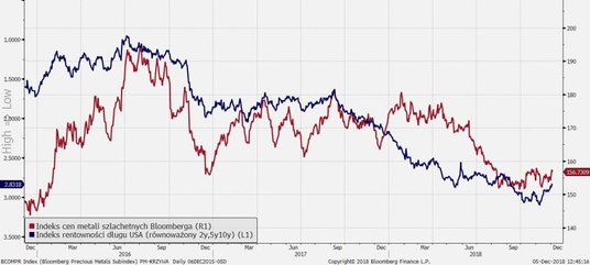 – Ceny energii tąpnęły, a dynamika PKB niechybnie spowolni. Należy dodać do tego zmianę strategii Fedu zakomunikowaną w ostatnich kilkunastu dniach przez prezesa Powella i potwierdzoną przez szereg wypowiedzi innych decydentów. Kolejne podwyżki stóp będą uzależnione w większym stopniu od bieżących sygnałów ze sfery realnej. W rezultacie rynek nie będzie się kwapił, by z dużym wyprzedzeniem dyskontować perspektywy polityki. W tym świetle uważamy, że wyprzedaż długu USA wyhamuje, a krzywa rentowności już w pierwszej części 2019 r. może ulec odwróceniu. Taka sytuacja pozwoliłaby na odbicie metali szlachetnych. Nasze prognozy zakładają, że cena uncji złota w 2019 r. powróci ponad 1300 USD. Na rynkach akcji powinno to skutkować relatywną siłą spółek wydobywających kruszec, np. skupionych w indeksie NYSE ARCA Gold Miners – prognozuje Sawicki.